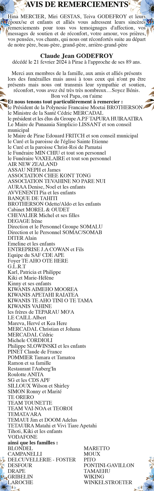 Avis de remerciements de la famille GODEFROY pour le défunt Claude Jean GODEFROY