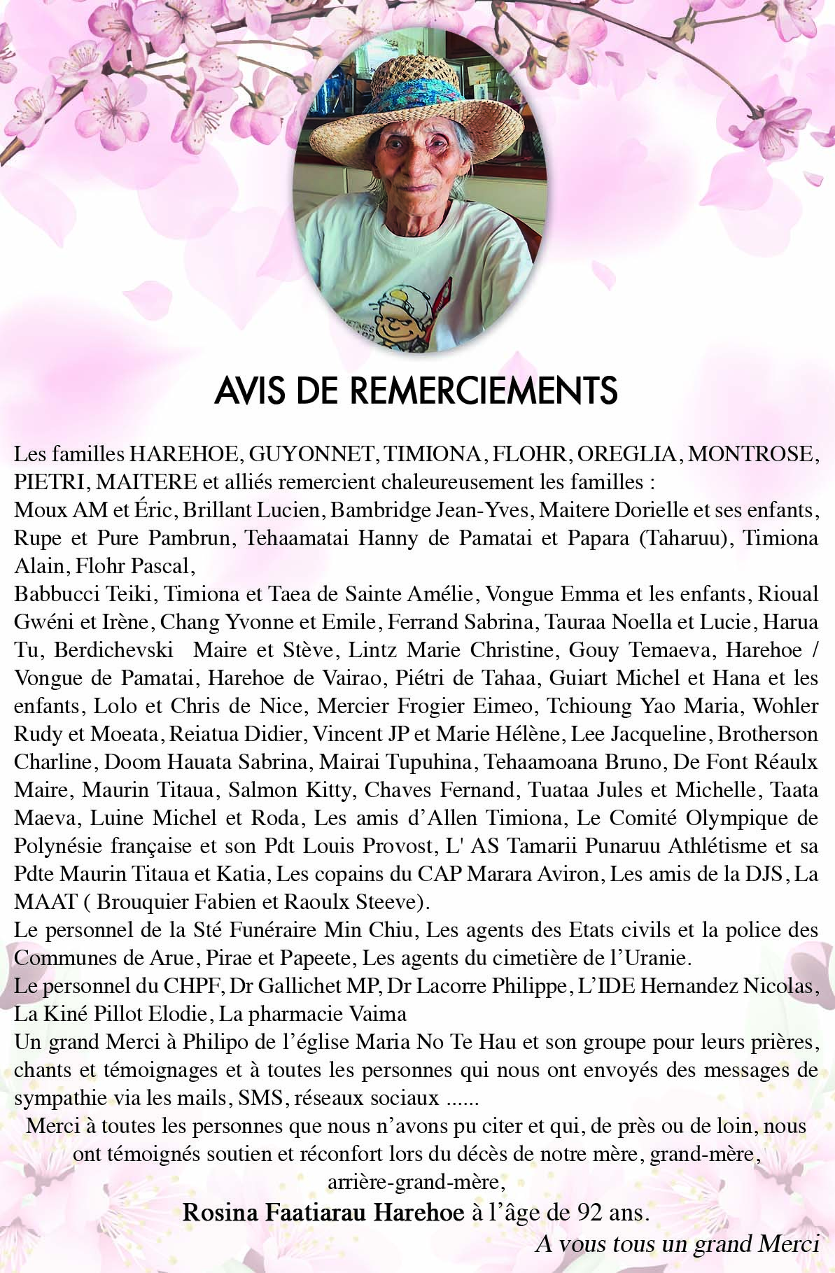 Avis de remerciements de la famille HAREHOE-GUYONNET pour la défunte Rosina FAATIARAU HAREHOE