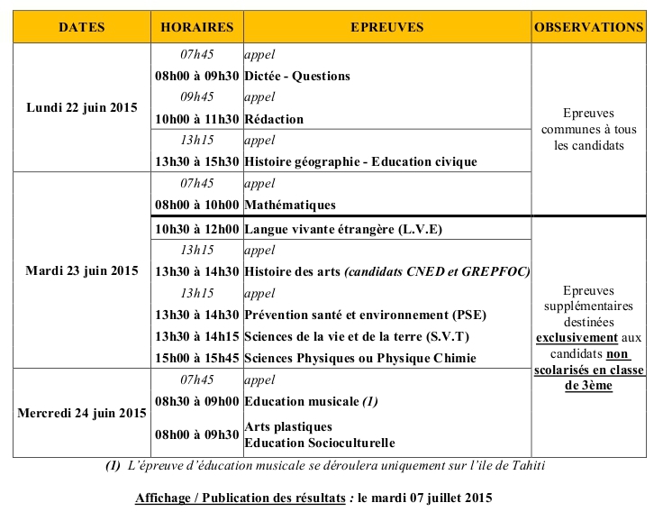 PAPEETE, le 2 décembre 2014. La Direction générale de l'éducation et des enseignements a publié les dates des examens du baccalauréat général et technologique ainsi que les dates du diplôme national du brevet.