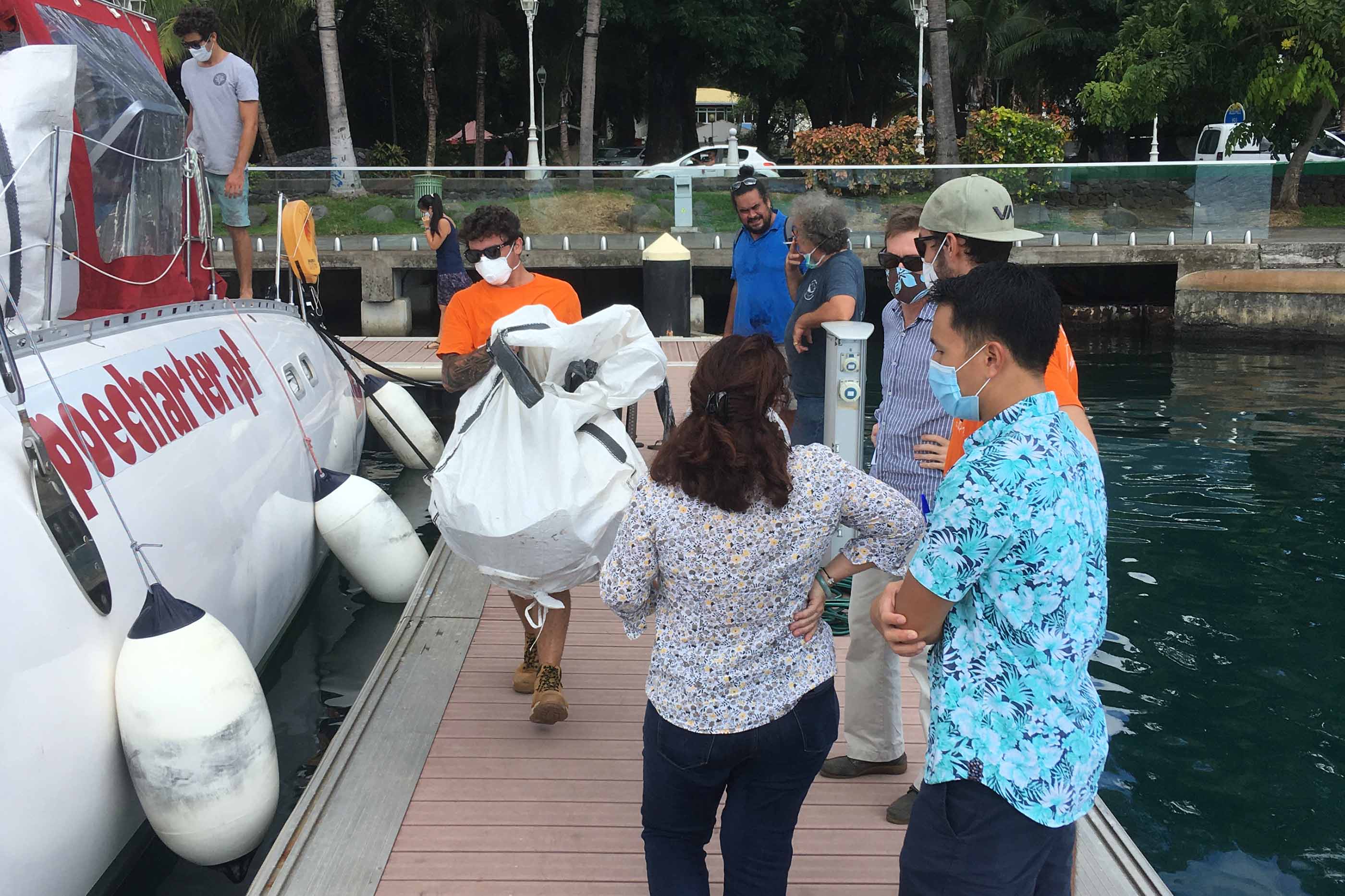 Tahiti, le 25 avril 2020 - Cinq spécialistes ont embarqué vendredi 24 avril à bord d’un catamaran pour rejoindre Arutua dans les Tuamotu. Attendus dimanche matin, ils doivent installer avec une équipe de Arutua un barrage flottant antipollution afin de protéger le lagon de l’atoll menacé par l’échouement du thonier chinois, le Shen Gang Shun, le 21 mars dernier.