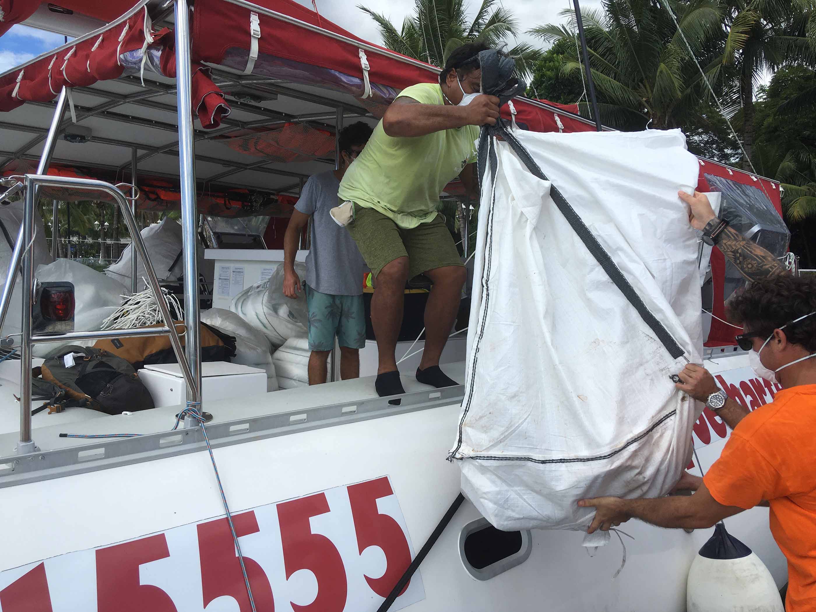 Sur place, ces cinq spécialistes embarqués à Papeete seront rejoints par une équipe de cinq personnes de Arutua qui viendront aider à la pose des 432 mètres de barrage emporté sur le catamaran. Entre les équipes qui ont embarqué à Papeete et l’équipe de Arutua, les consignes de distanciation et de protection en vigueur dans le cadre du Covid-19 seront appliquées de manière rigoureuse, pour qu’il n’y ait aucun contact entre les équipes de Tahiti et la population de l’atoll. Les équipages embarqués à Papeete dormiront à bord du catamaran et ne descendront pas à terre.