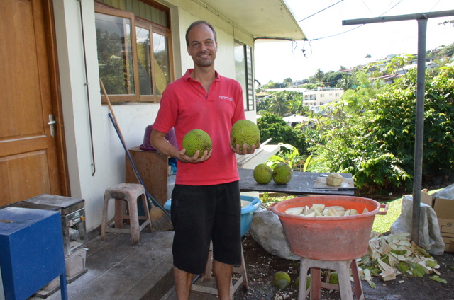 Chaque matin, c'est le même rituel, Benjamin Huber, dit Beni, récupère les 'uru chez lui, dans les hauteurs de Paofai, à Papeete. Ce suisse, installé à Tahiti depuis 10 ans, est un vrai entrepreneur. " A Tahiti, tu peux tout faire quand tu as des idées", s'enthousiasme-t-il. C'est lui qui a imaginé la farine de 'Uru (appelé aussi fruit de l'arbre à pain). "Trop de 'uru tombe de l'arbre, c'est du gaspillage, il fallait trouver une solution". Il a donc décidé de le valoriser il y a deux ans. Le principe est simple : les tahitiens viennent directement lui apporter leur 'uru tombé de l'arbre le matin-même (il faut le contacter auparavant) et ensuite, il se charge de le transformer.