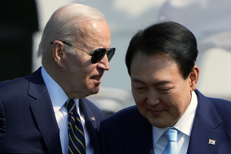 Washington, Etats-Unis | AFP | mercredi 26/04/2023 - Le président américain Joe Biden a accueilli en grande pompe mercredi à la Maison Blanche son homologue sud-coréen Yoon Suk Yeol, les deux dirigeants devant annoncer un renforcement du parapluie sécuritaire des Etats-Unis pour cet allié clé face à la Corée du Nord.