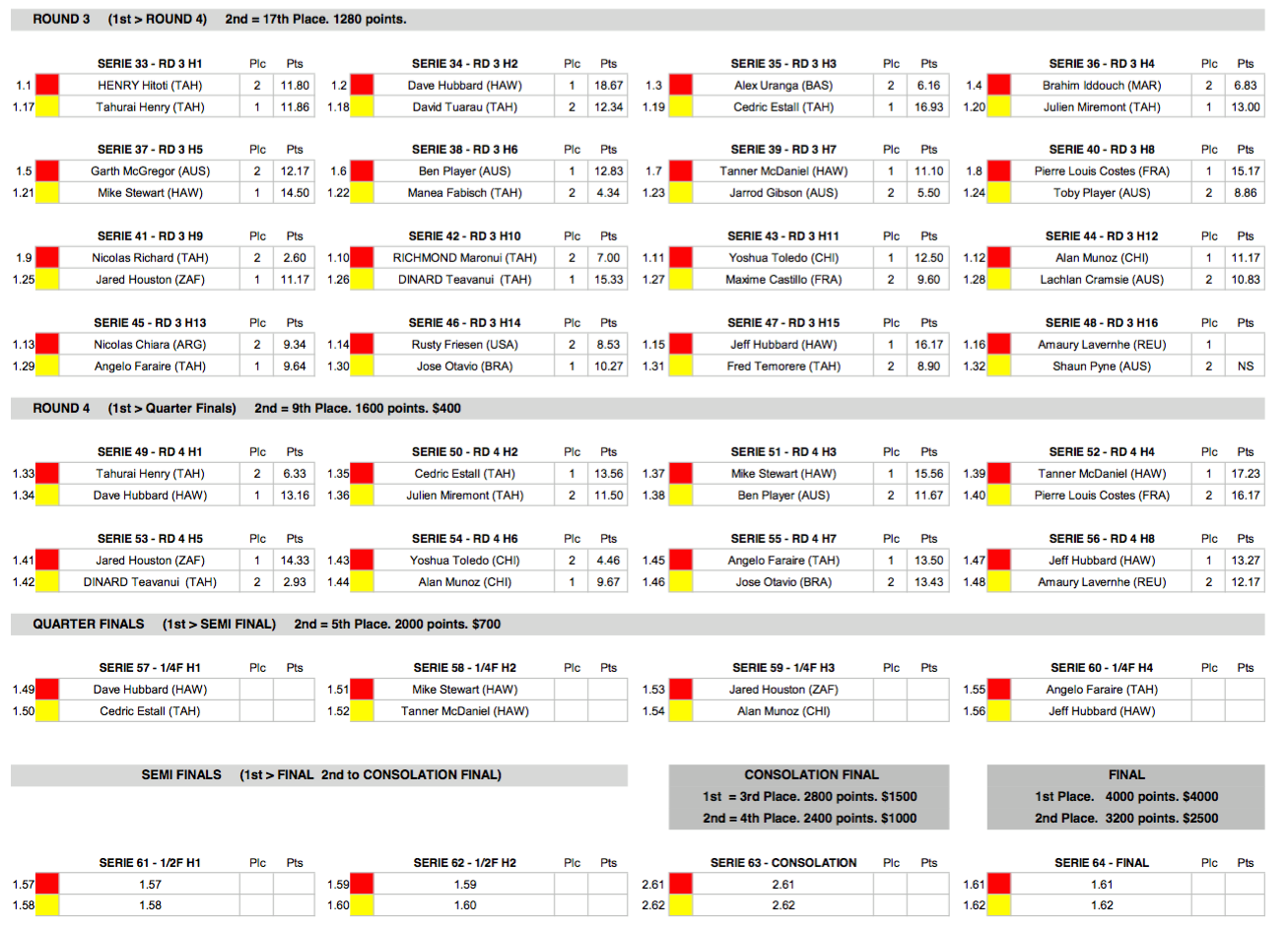 Sur les 14 Tahitiens inscrits sur les 48 compétiteurs, 5 ont réussi à se hisser jusqu’au round 4. Il s’agit de Tahurai Henry, Cédric Estall, Julien Miremont, Teavanui Dinard, et Angelo Faraire. Lors de la première étape à Hawaii, il y en avait eu 2 sur 5 inscrits au départ, Julien Miremont et Angelo Faraire.