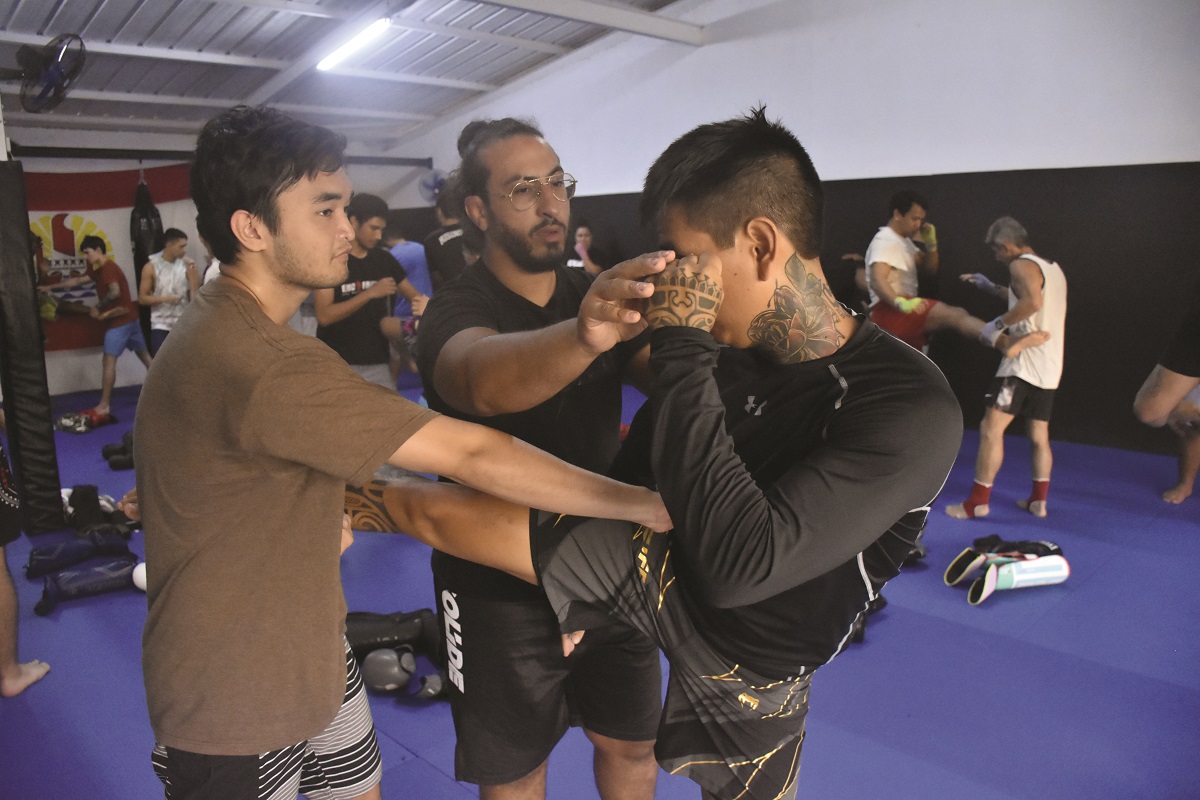 Yassine Ouakil (au centre) lors d'une séance d'entraînement en muay thai au club Sphere MMA, à Arue.