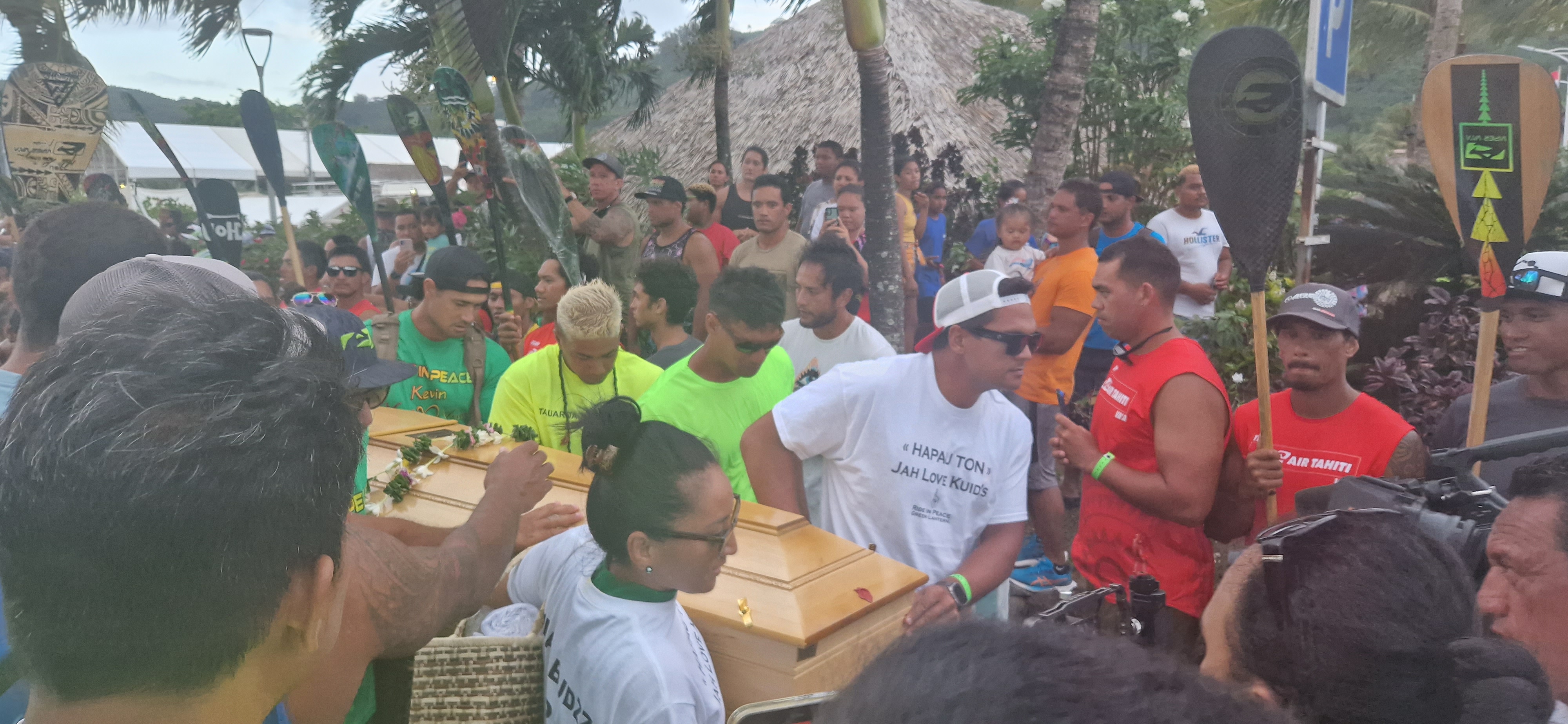 Bora Bora le 6 novembre 2023 - Kevin Kouider, le ‘aito du va’a décédé jeudi dernier, a regagné la Perle du Pacifique qui l’a accueilli avec beaucoup d’émotion, vendredi soir.