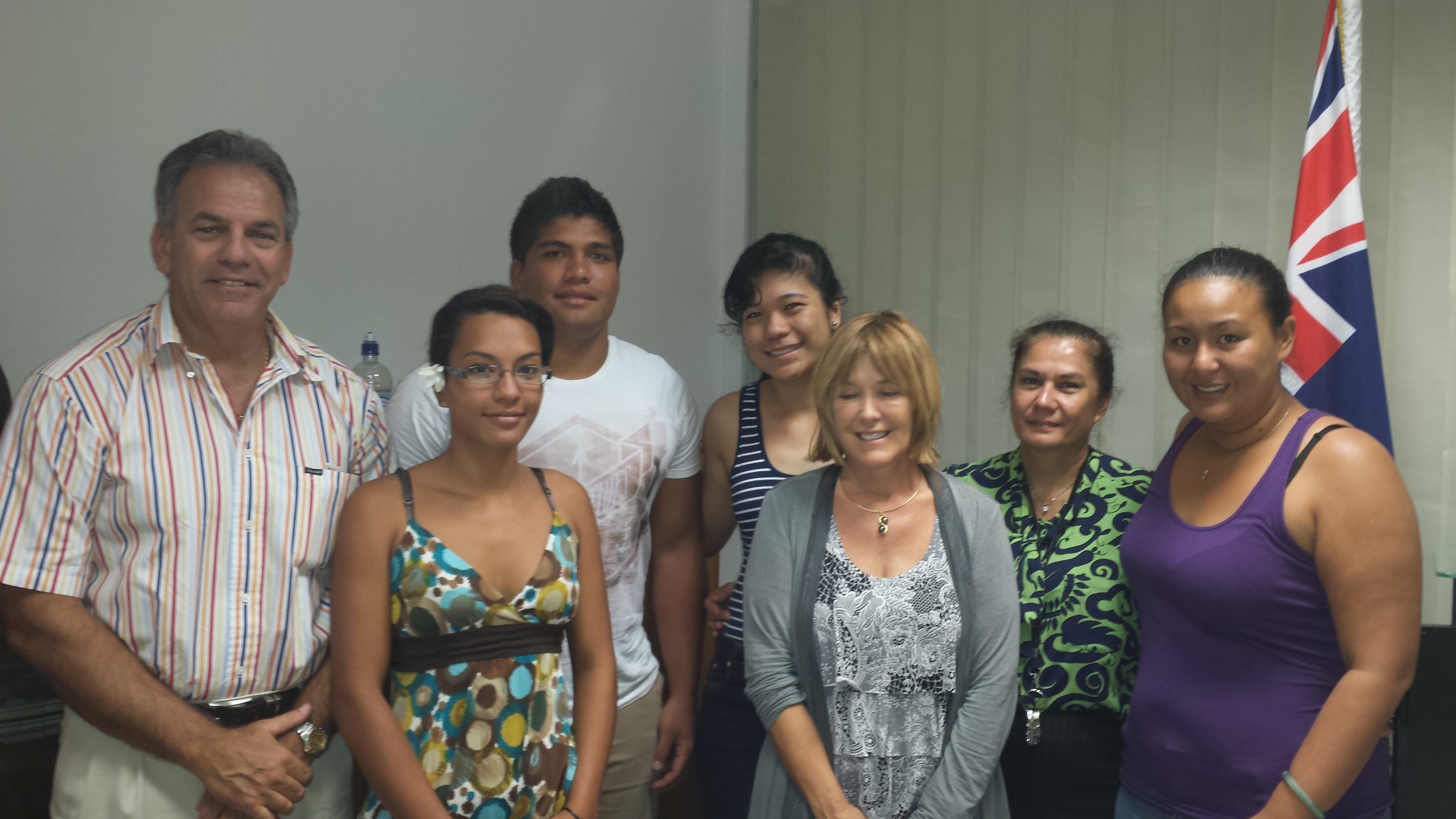 La promotion 2014. Sur la photo : Eric Malmezac Consul honoraire de la Nouvelle-Zélande, Hirirau Lacour, Henri Burns, E'eva Leaou, et Nahema Chan-Lin, lauréats, Michèle Lewon, chef du bureau des relations et échanges internationaux de la DGEE et Maeva Lebrun, office administrator Air new-zealand.