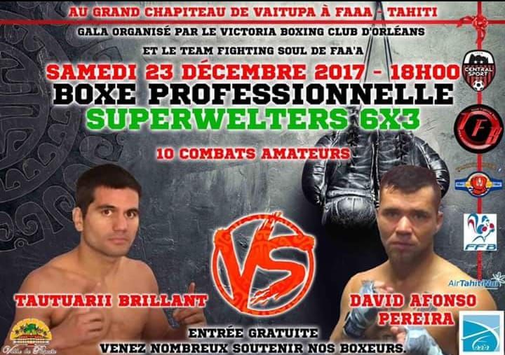 Les combats amateurs seront suivis par une rencontre de boxe professionnelle opposant Tautuarii Brillant à David Alfonso Pereira. Les deux boxeurs professionnels évoluent dans la catégorie des superwelters (67-70 kg), le combat de fera en six reprises de trois minutes. L’entrée est gratuite. SB & FBAPF