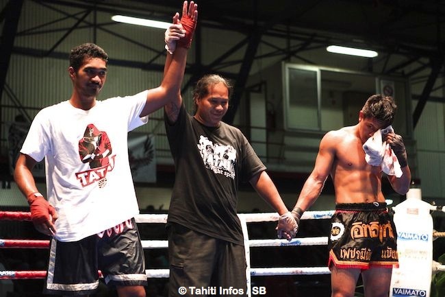 Le 1er combat en catégorie ‘amateur’ a opposé Benjamin Desnos du MT Pirae à Kalani Kavera de Tini Thaï Boxing. Benjamin s’était déjà illustré le 29 novembre dernier lors du championnat ‘Aito’ en remportant son combat, il récidive en s’imposant aux points. Benjamin est un excellent compétiteur, lors des deux premiers rounds de 2 minutes, il a utilisé toute la panoplie de coups de la boxe thaï, notamment les coups de genoux.