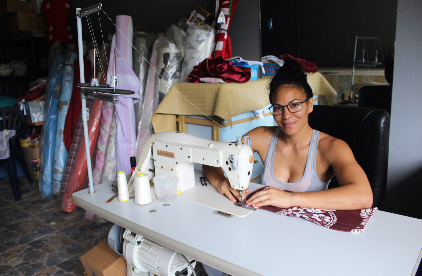 Rouleaux de tissus alignés en ordre le long du mur, machine à coudre et bobines de fil posées à coté, Edith Tavanae s'applique à la confection de nouveaux rideaux ou de housses de coussins. La jeune femme a trouvé dans la couture un job qui la passionne. En avril 2018, elle a même décidé de créer son atelier de relooking de tissus d'ameublement, jouxtant sa maison, dans le quartier de la Mission à Papeete. Depuis, la demande est là. Petit à petit, le bouche-à-oreille a fonctionné et la trentenaire s'est fait connaître dans ce nouvel univers pour elle, qu'est la couture.