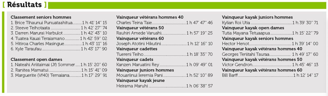 Première course V1 de la saison pour “le sergent”, mais ce n’était pas le cas pour tout le monde. Brice Punuataahitua et Steeve Teihotaata se retrouvaient après la Taaora Race de février. Les deux premiers de cette course ont livré une bataille similaire pour se retrouver sur les mêmes places du podium que lors de la précédente course. “Il y a un peu plus d’écart que lors de la Taaora entre nous, ça prouve qu’il est en forme, le copain ! Il me faut encore un peu de temps pour revenir au poids de forme, mais techniquement, je suis bien. À l’entrée, j’ai vu qu’il n’y avait pas de balise à contourner, donc j’ai pris au plus court, quitte à toucher un peu les cailloux. Ça m’a permis de prendre la deuxième place devant Darren Harbulot qui est un ami et un partenaire d’entraînement. On va enchaîner les courses jusqu’au mois de juin. On a un gros programme, mais ce sont toujours de belles aventures.”