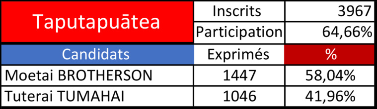 Tahiti, le 18 juin 2022 - Moetai Brotherson l'emporte à Taputapuātea avec 1 447 voix (58,04%) face à Tuterai Tumahai et ses 1 046 voix (41,96%), au second tour des élections législatives.