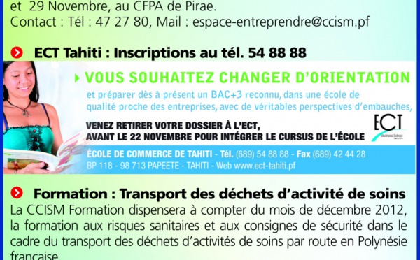 Quelques liens utiles : - Espace Entreprendre, des conseils pour bien démarrer - ECT Tahiti : Inscriptions au tél. 54 88 88 - Formation : Transport...