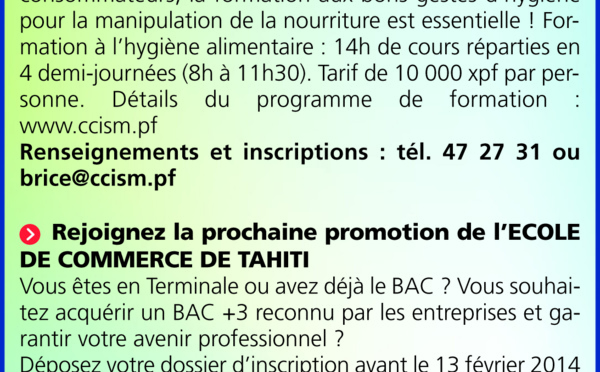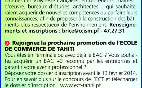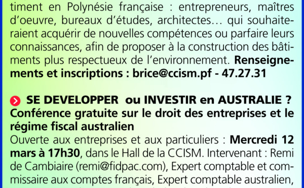 Quelques liens utiles: - La Polynésie française, l’ADEME et la CCISM organisent en partenariat une formation à l’Ecoconstruction du 22 au 29 avril...