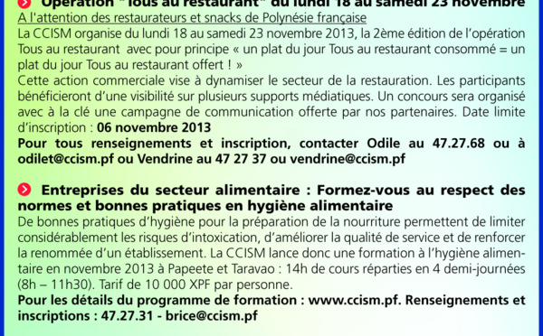 Quelques liens utiles: - TOUS au RESTAURANT du lundi 18 au samedi 23 novembre 2013 - Entreprises du secteur alimentaire : Formez-vous au respect des...