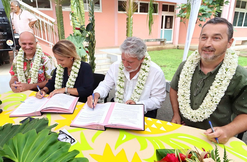 Elle a été signée par Jean-Christophe Bouissou, vice-président de la Polynésie mais aussi président du syndicat mixte, Virginie Bruant, ministre du Travail, des Solidarités et de la Formation, Guy Fitzer, chef des subdivisions administratives des îles du Vent et des îles Sous-le-Vent, et Jean-Michel Blanchemanche, directeur du CFPA.