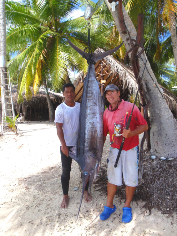 Contrairement à certains marlins ou à l’espadon voilier, ce thon ne gratifie pas les pêcheurs de cabrioles hors de l’eau. Il maintient la ligne tendue à l’extrême, à plusieurs mètres de la surface. Quand le pêcheur gagne quinze ou vingt mètres en moulinant avec énergie, le “bestiau” ne se gêne pas, profitant du frein du moulinet, pour reprendre trente ou quarante mètres. Relever la canne puis mouliner dans la foulée ne souffre aucun dixième de seconde de “mou” ou de relâchement. C’est pourtant ce qui arrive : une fraction de seconde, le fil n’est pas tendu, fragment de temps qui suffit au thon pour se décrocher et prendre la fille de l’air, au nez et à la barbe de celui qui le travaillait depuis un bon quart d’heure. Parti ! Envolé ! Echappé ! Au large de la passe de Tiareroa, ce ne sont pas toujours les hommes qui font la loi, loin de là. Mais des mordages, il y en aura d’autres dans la journée et le retour, après une journée de grand air marin, se fera avec les honneurs, puisque la glacière contiendra ce qu’il faut de poissons frais pour nourrir la tablée de Cocoperle Lodge ce soir…