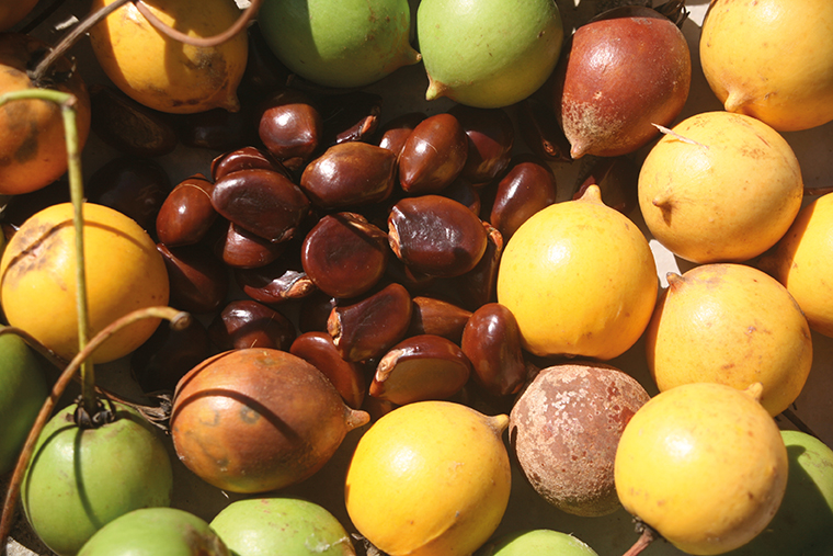 Une des particularités de Raivavae est la présence, au port de Rairua mais également tout autour de l’île, de nombreux « faux tamanu », des arbres dont le fruit ressemble à s’y méprendre à celui du tamanu (Calophyllum inophyllum). Or, à maturité, ils deviennent jaune d’or, contrairement au tamanu dont les fruits ne prennent pas une couleur aussi marquée et surtout qui ne contiennent qu’une seule graine ; les pommes d’accot, puisque tel est leur nom (Mimusops coriacea), renferment six graines marron que les artisans utilisent de plus en plus dans la confection de colliers. La chair du fruit, farineuse, est comestible et d’ailleurs elle est consommée à Madagascar d’où est originaire ce très bel arbre ornemental. Contrairement au tamanu, sur l’apex du fruit on peut voir un petit renflement caractéristique qui permet de le reconnaître immédiatement.