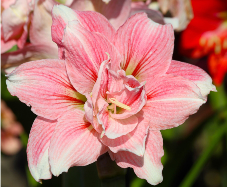 Les amarilis sont splendides lorsqu’ils fleurissent et celui-ci (double), avec ses veines rouge foncé sur fond rose pâle, est spectaculaire.