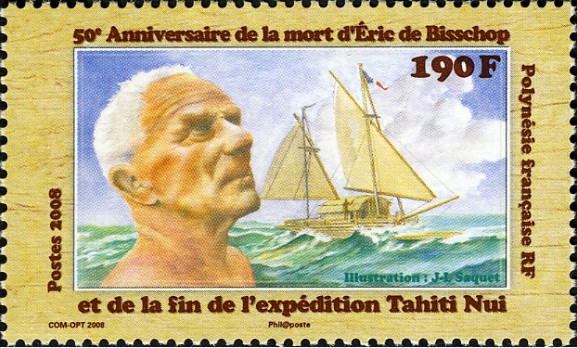 La Polynésie française, en 1988, a honoré le trentième anniversaire de la mort d’Eric de Bisschop avec ce timbre représentant le voyage aller du “Tahiti Nui I” et le voyage fatal, au retour, du “Tahiti Nui II”.