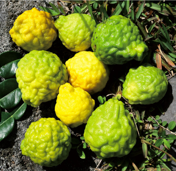 Encore un agrume facile à trouver à Rurutu ; verruqueux et grumeleux, son écorce est caractéristique. Originaire d’Inde, l’arbre qui le porte est très épineux. Les Rurutu apprécie sa forte acidité qu’ils utilisent pour blanchir les feuilles de pandanus destinées au tressage. Le zeste a sans doute l’un des plus doux parfums émanant des agrumes (un peu comme la citronnelle) et l’on s’en sert comme condiment pour relever de nombreux plats cuits. Le jus sert aussi à se laver les cheveux, qui restent très brillants et qui deviennent plus forts. Une merveille…