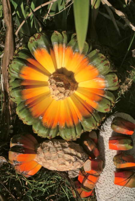 Le pandanus, fara en tahitien, est un polyfruit atteignant 30cm de diamètre ; selon les espèces (neuf en Polynésie) les fruits, qui contiennent une petite amande que l’on consommait en temps de disette, peuvent être très clairs, ou, au contraire, plutôt orange vif, comme l’espèce dominante à Rurutu. Ils sont délicieusement parfumés, et l’on s’en sert pour confectionner les couronnes des colliers de bienvenue ou de départ. Au Kiribati, on continue à consommer les fruits du fara.