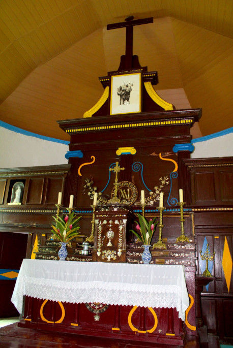 Le ciel est d’un bleu limpide et quelques voiliers au mouillage annoncent le quai de Taravai, notre première étape. A peine débarqués, nous passons sous la porte majestueuse frappée des cœurs entrelacés des Picpus (la congrégation des sacrés cœurs de Jésus et de Marie, dont les missionnaires ont évangélisé tout l’archipel). Nous sommes à deux pas de l’église gothique consacrée à St Gabriel, bâtiment élancé et silencieux accentuant encore la sérénité qui se dégage du jardin ceignant l’édifice (terminé en 1868). Orangers, uru, piments, pamplemousses, le fa'a'apu entourant l’église a un petit arrière-goût de paradis perdu. La porte d’entrée est fermée mais non verrouillée. Nous pénétrons en silence dans l’édifice parfaitement entretenu par les quelques ouailles vivant encore sur cette île. De chaque côté du maître autel, érigé sous un ciel étoilé, deux doubles cœurs sont peints contre le mur, double cœurs que l’on retrouve sur la partie avant de l’autel. Les boiseries, dans lesquelles sont incrustées de la nacre, sont splendides ; indubitablement, cette église, certes modeste, est « habitée », ne serait-ce que par la foi quasiment palpable de ses fidèles.