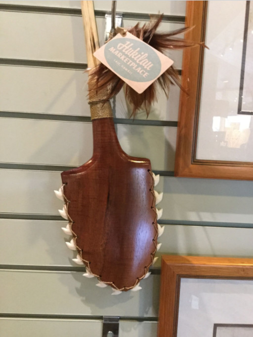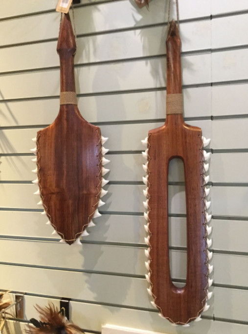 Le pire exemple nous a été donné par le Polynesian Cultural Center, qui devrait justement être irréprochable en la matière ; dans au moins l’une de ses boutiques, un mur presque complet expose et propose à la vente de nombreuses « armes » plus ou moins bien sculptées et toutes garnies d’innombrables dents de squales. Plus fort encore, certaines de ces créations d’un goût douteux portent même le label « Polynesian Cultural Center », comme si l’on pouvait encore être fier de réaliser et de commercialiser de tels objets.