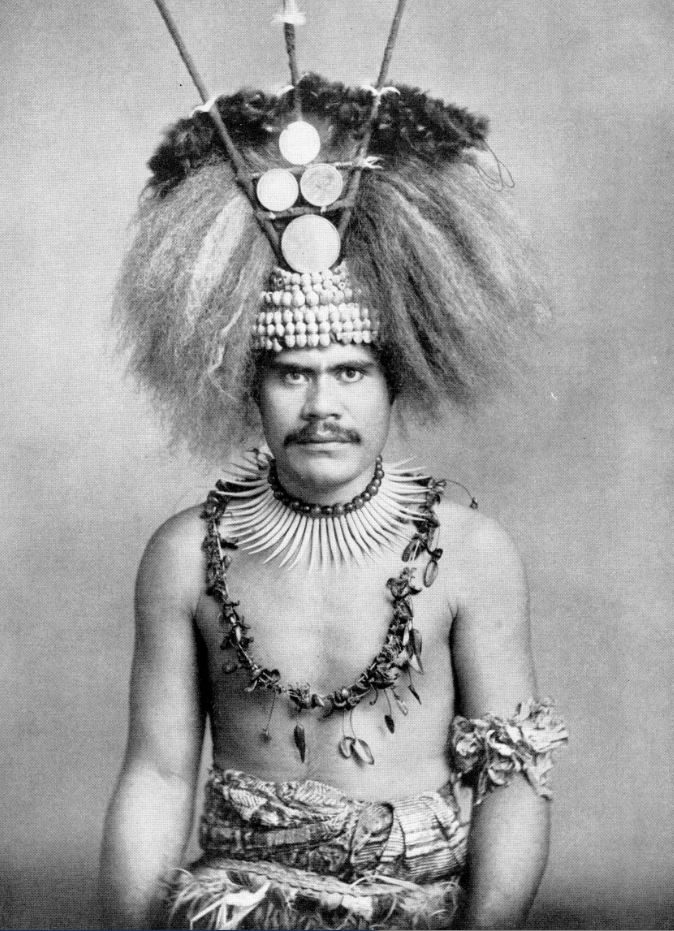 Un splendide guerrier samoan dans sa tenue de cérémonie ; on notera son collier en ivoire, les dents pointues étant taillées dans de grosses dents de cachalot. Celles-ci venaient souvent des Tonga ou des Fidji.