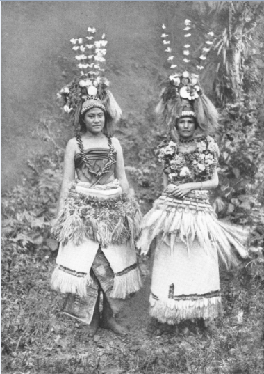 Visiblement sous le charme, le photographe s’est contenté de légender sa photo de manière laconique : « sirènes ». A gauche, la plus jeune porte un tapa sous sa jupe blanche. Les coiffes sont dignes de notre Heiva…
