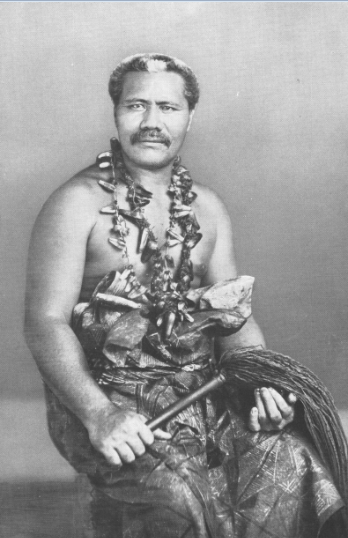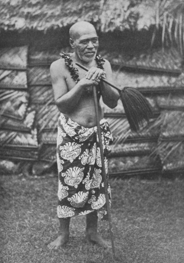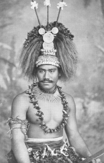 Un guerrier samoan dans sa tenue d’apparat. On notera la complexe coiffe dont la base est faite de coquillages et surtout son collier ; celui-ci est en ivoire : les petites dents pointues étaient taillées dans la longueur de dents de cachalot ; plus le collier était imposant, plus fort, plus chargé de mana était le guerrier.