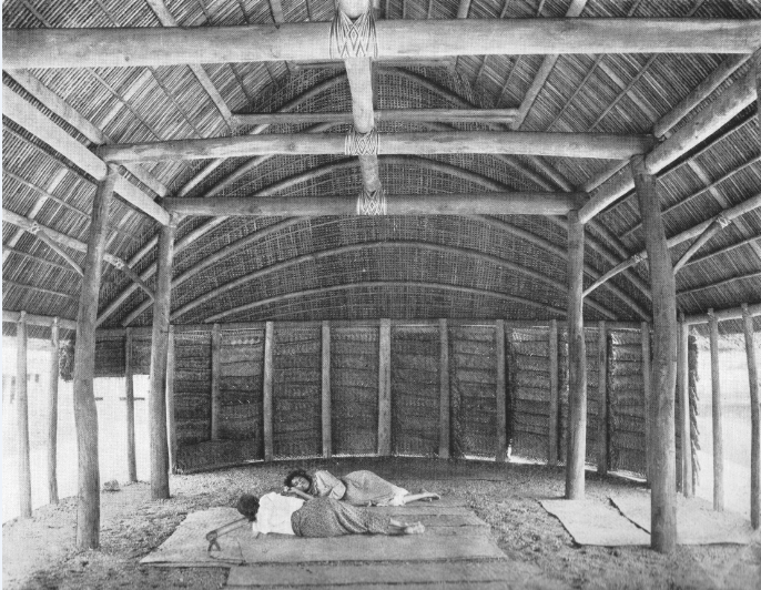 Intérieur d’un fare (fale en samoan) de noble ; on notera les ligatures fixant solidement les poutres. L’oreiller du dormeur vu de dos est un bambou sur deux supports.