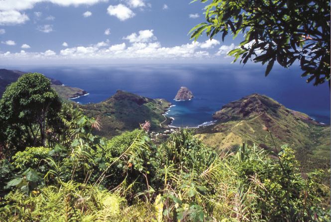 Les deux plus belles vallées de Ua Huka, où ont été trouvés les tiki sacrés que nous évoquons aujourd'hui : au centre, la baie de Hane et, sur la gauche, la baie de Hokatu.