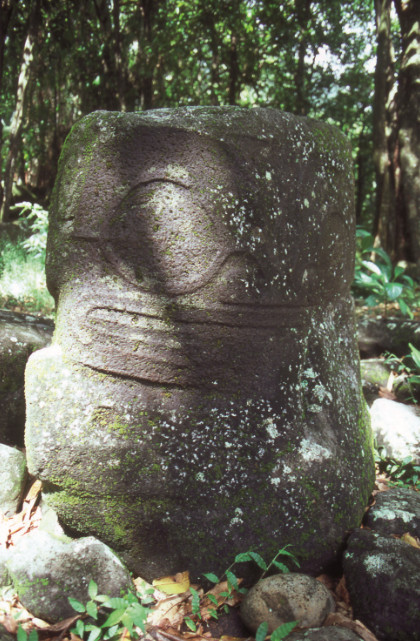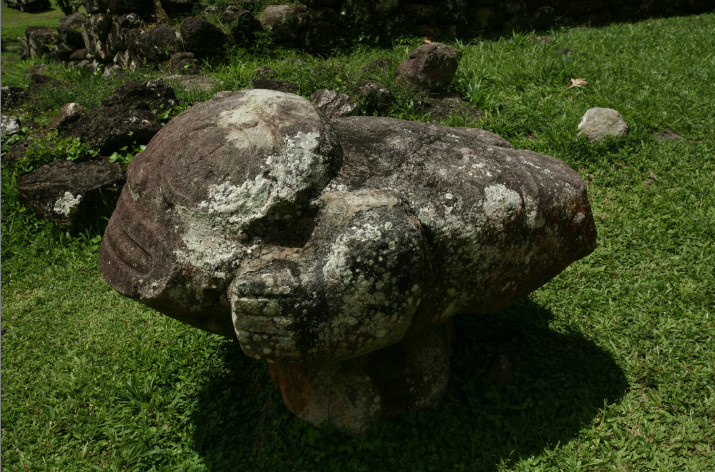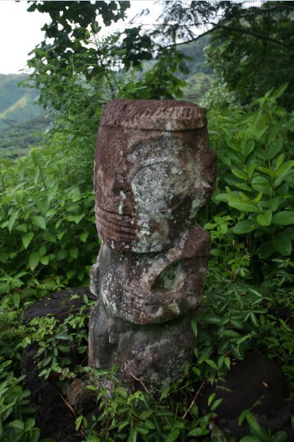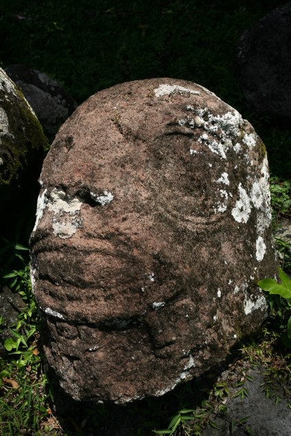 On trouve plusieurs tiki sur le très beau site de Puamau, et plusieurs fragments de tiki, dont cette fort belle tête en tuf rouge, très usée par le temps, la pluie et le soleil.