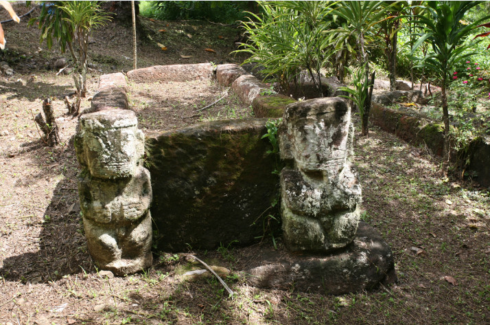Voici deux tiki d’une rare beauté, pas forcément connus du grand public d’ailleurs même si leur accès est très aisé. On peut en effet les admirer en sortant du restaurant de Marie-Antoinette, à Puamau. Il s’agit en fait de la tombe d’une princesse, tombe que l’on imagine datant de la christianisation de l’île (on n’exposait plus les corps, on les enterrait, mais on préférait encore la protection de deux tiki plutôt que celle d’une croix). La sépulture, parfaitement bien entretenue, est faite de plaques de lave rouge (keetu) alors que deux tiki d’un mètre de hauteur environ, aux longues oreilles, montent la garde devant elle. Cette princesse aurait été la dernière cheffesse de la vallée : on lui connaît plusieurs noms : Tahiatitoihani ou Vehine Titoiani (« celle qui fait l’amour avec le ciel »), qui seraient des surnoms selon l’Académie marquisienne. Son véritable nom aurait été Tehaumoea (la paix) ou Haumoea (« paix »).