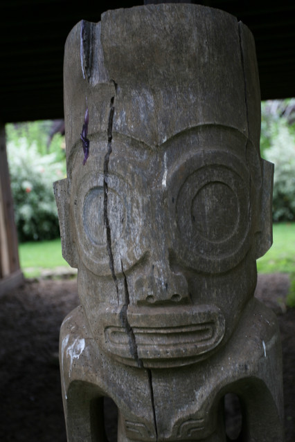 Il y a quelques années seulement, ce pilier de bois, dans l’enceinte du centre Paul Gauguin, avait été sculpté avec soin, mais malheureusement, le temps efface tout, y compris ce genre de travail très expressif, démontrant que les sculpteurs d’aujourd’hui peuvent rivaliser sans problème avec ceux des temps anciens. Mais entre les fientes d’oiseaux, les termites et autres vrillettes, sans parler des intempéries, il est bien difficile de conserver ces sculptures, à moins, bien sûr, de les entretenir avec méthode et rigueur (produits anti-termites, lasure, etc.).