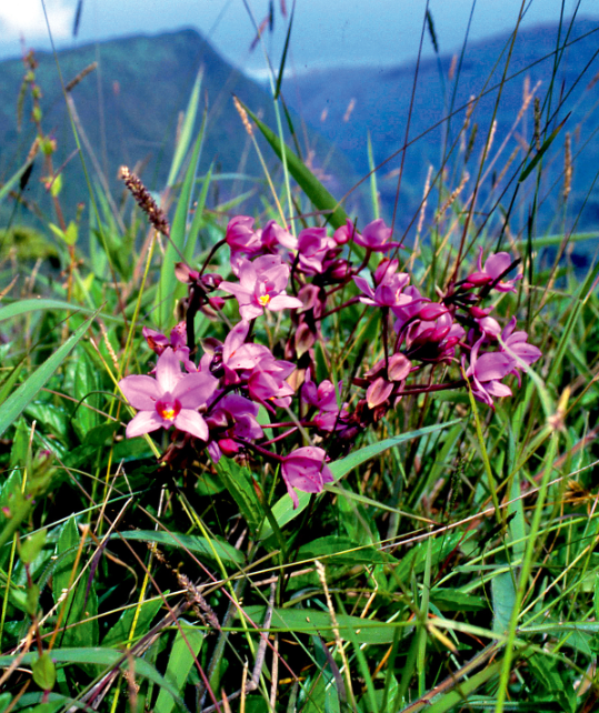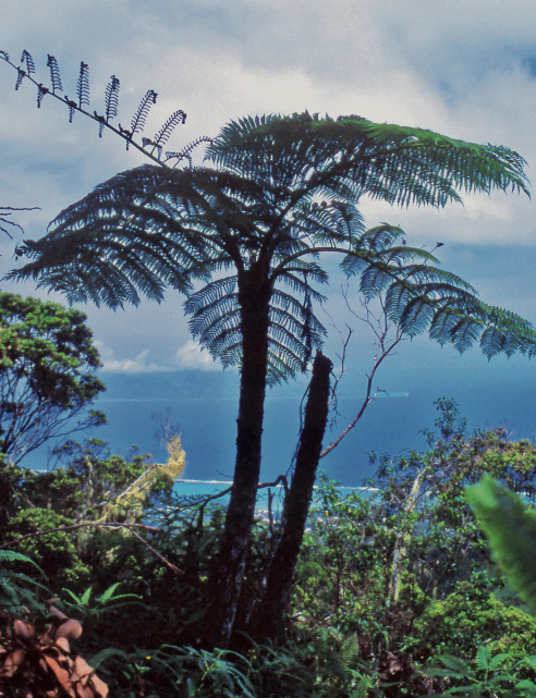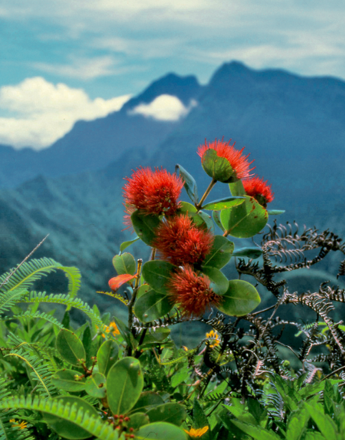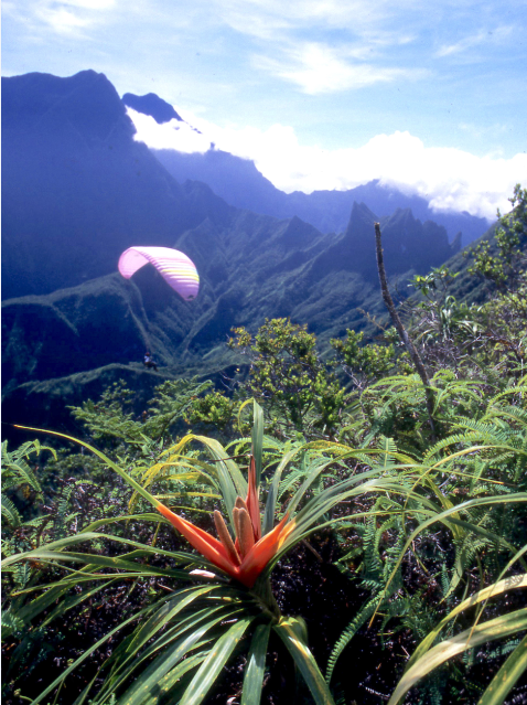 Une splendide Freycinetia impavida observe, impassible, le vol d’un parapentiste. Famille des Pandanaceae. En arrière plan, l’Aorai (2 066 m) et le sommet double de l’Orohena (2 241 m) dans le lointain.