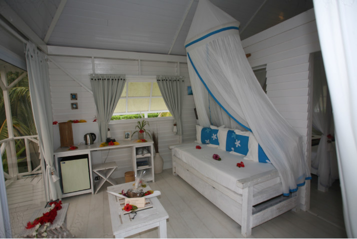 Neuf de ces petits fare sont à la disposition de la clientèle, entre lagon et jardin, ceux qui ne donnent pas sur la mer étant posés en bordure de piscine. Le qualificatif « petit » n’est d’ailleurs pas celui qui convient, puisqu’avec leur surface de 50m2, ils offrent aux visiteurs une superbe terrasse, un coin salon (et lit d’appoint), une magnifique chambre dotée d’un vaste lit à baldaquin et moustiquaire, une non moins vaste salle de bains et des toilettes séparées. Bref, ces intérieurs « grand large » sont lumineux, très typés, joliment décorés avec des éléments à la fois sophistiqués et apportant parfois une délicate touche de naïveté.