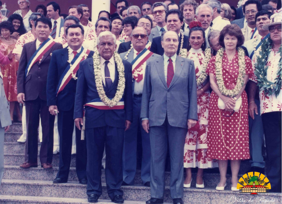 François Mitterrand devant la mairie de Papeete, le jour de son inauguration officielle, il y a 28 ans exactement ; le maire d’alors était Jean Juventin et le président Alexandre Léontieff (Photo : site officiel de la mairie de Papeete). Le séjour polynésien du président de la République avait eu lieu du 15 au 18 mai 1990. Il gomma en partie la mauvaise impression laissée le 14 septembre 1985 par François Mitterrand qui, de France via la Guyane, était venu une journée à Moruroa en Concorde, avant de repartir à Paris le soir même, sans passer par Tahiti…