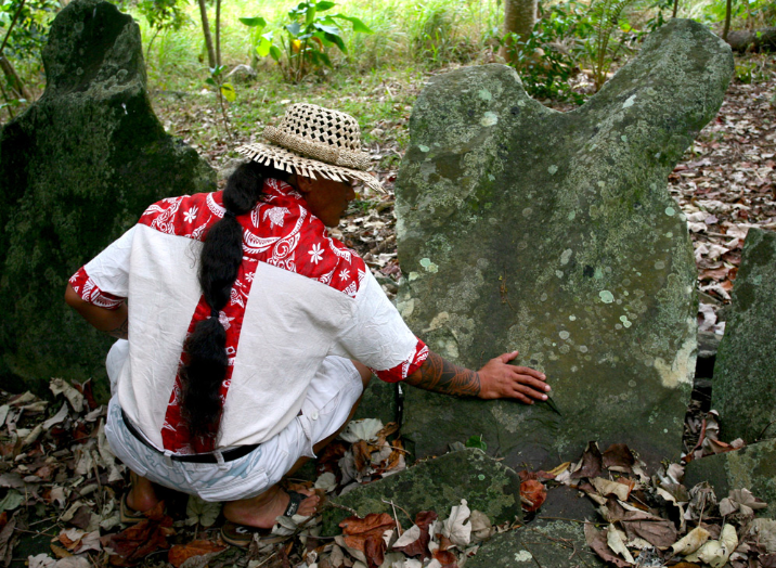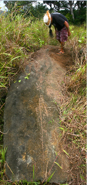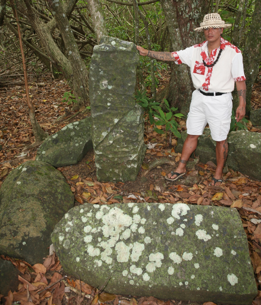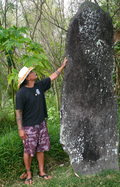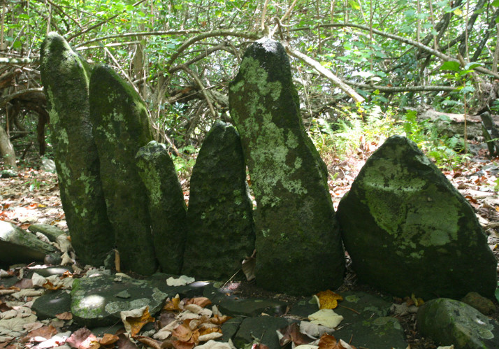 Tubuai, avec ses grands monolithes de lave jadis dressés sur ses marae, a dû avoir, dans les temps anciens, un petit air de Bretagne avec ses menhirs pointant vers le ciel. Les sites archéologiques, nombreux, mettent en évidence l’importance des pierres dans la conception des espaces cultuels sacrés ; certes pas des pierres très sophistiquées, taillées, polies, assemblées, juste des dalles fichées dans le sol et délimitant des espaces couverts de dallages sur lesquels pointent de plus petites pierres, fichées au-dessus des restes d’un sacrifié : les entrailles, les os et le crâne du malheureux mis à mort étaient en effet enterrés sur le marae et le site était marqué d’une petite pierre, l’importance du marae se jugeant notamment au nombre de ses pierres dressées.