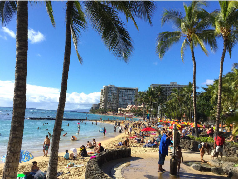 Une vue partielle de la plage de Waikiki, où d’innombrables « fidèles » sacrifient au dieu soleil. On n’est pas obligé d’y bronzer « idiot », on peut aussi s’intéresser aux nombreux bronzes qui ornent ce quartier touristique de Honolulu…
