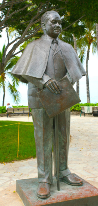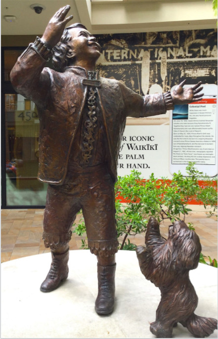 En bord de mer, dos à la plage, le prince Kuhio (1871-1922) semble veiller sur son peuple, lui qui fut surnommé de son vivant le « prince du peuple ». Jonah Kuhio Kalaniana’oie Pi’ikoi eut une vie pour le moins mouvementée. Réfractaire à l’annexion américaine sur Hawaii, jeune il fut un indépendantiste convaincu et très engagé puisqu’il fit même de la prison après une rébellion armée en 1895 (il s’en tira avec un an ferme).