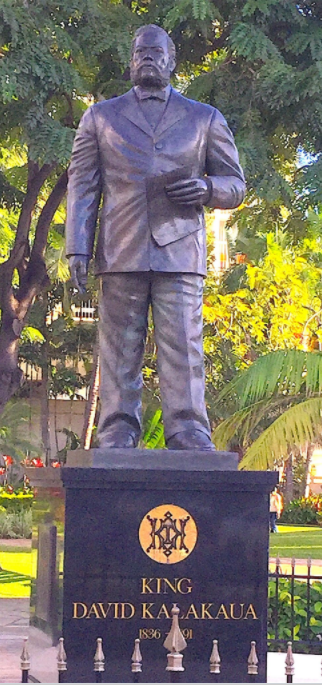 A tout seigneur, tout honneur, place à David Kalakaua lui-même (1836-1891), de son vrai nom David La’amea Kamananakapuu Mahinulani Naloiaehuokalani Lumialani Kalakaua. Né le 16 novembre 1836, il monta sur le trône de ce qui était alors un royaume le 12 février 1874. Il symbolise à lui seul le renouveau de la culture hawaiienne et de son identité. Sa devise était « Ho’oulu lahui », qui peut se traduire par « Laissez le peuple hawaiien s’épanouir ». Il était jovial, grand amateur de musique (c’est lui qui fit du ukulele portugais l’instrument emblématique de l’archipel). Son règne fut marqué par une grande prospérité grâce au « Reciprocity Treaty de 1875 » signé avec les USA, qui obtinrent alors le monopole de l’usage du port de Pearl Harbour. Il effectua un tour du monde et ouvrit en grand les vannes de l’immigration pour aider au développement des îles Hawaii. Il mourut à San Francisco le 20 janvier 1891 (sa statue érigée en 1985 est située à l’embranchement de Kuiho et de Kalakaua avenue à Waikiki.