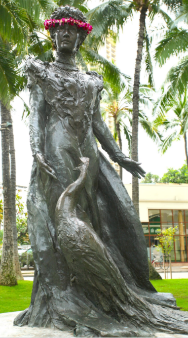 A l’autre bout de Waikiki, c’est une statue de l’épouse du roi Kalakaua qui est aujourd’hui encore honorée ; la reine Kapi’olani (1834-1899), de son nom complet Kapiʻolani Napelakapuokakaʻe.