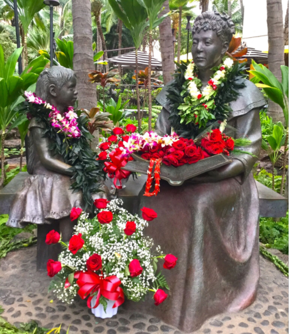 Dans les jardins du Pink Palace (le célébrissime Royal Hawaiian Hotel) se dresse, devant une fontaine rafraîchissante, cette apaisante sculpture intitulée « The inspired vision of Pauahi » (E Ola’o Kalani e Pauhilaninui, en Hawaiien). Le sculpteur, Sean KKL. Brown, qui fut étudiant à la Kamehameha School, rend hommage à la princesse Bernice Pauahi Paki (1831-1884) dont la famille possédait 9 % des terres de l’archipel hawaiien. Bernice, avec ses revenus, fonda la réputée Kamehameha School avec l’aide et l’appui de son mari, Charles Reed Bishop.