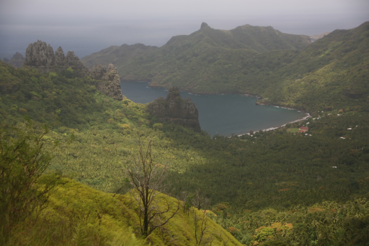 À un peu plus d'une heure de Taiohae, sur la grande île de Nuku Hiva, dans le groupe nord du Fenua Enata, se dressent les pics de la vallée de Hatiheu, éperons de basalte plongeant leurs verticalités de magma figé dans l'océan.
