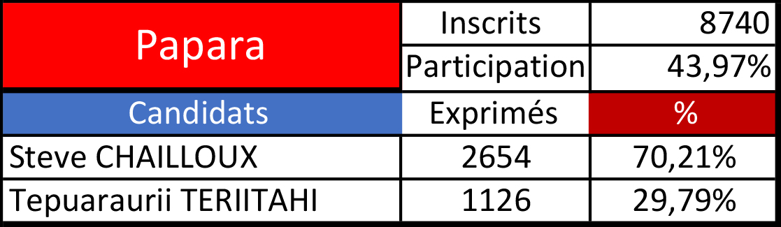 Tahiti, le 18 juin 2022 - Steve Chailloux l'emporte à Papara avec 2 654 voix (70,21%) face à Tepuaraurii Teriitahi et ses 1 126 voix (29,79%), au second tour des élections législatives.