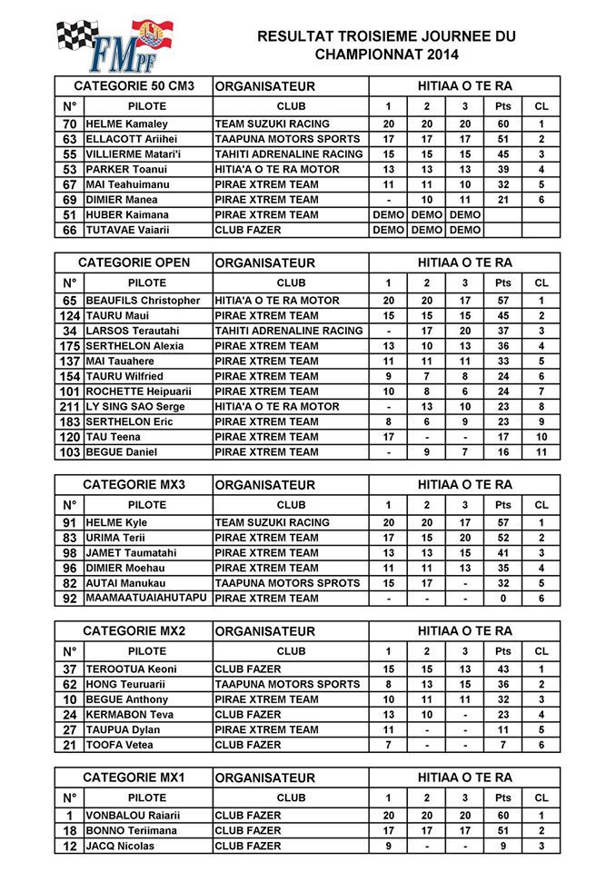 En MX 2 c’est Keoni Terootua qui s’impose devant Teuruarii Hong alors qu’en MX 3 c’est Kyle Helme qui termine premier de la journée devant Terii Urima. En catégorie open, la catégorie la plus représentée avec 11 pilotes sur la ligne de départ, c’est Christopher Beaufils qui s’impose devant Maui Tauru et Terautahi Larsos. En 50 cm3 c’est Kamaley Helme qui s’impose en remportant les trois manches de la journée devant Ariihei Ellacott.