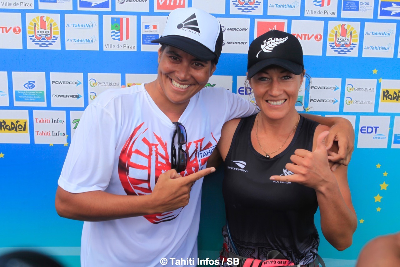 Contrairement aux deux premiers jours de course, le vent a été présent dès le lancement de la première course, la course open femme V1. Hinatea Bernadino, qui s’était imposée lors du Te Aito la semaine dernière, a confirmé son statut de leader en s’imposant largement devant la Néozélandaise Marianna Hodges et la Calédonienne Marcy Barbou, apportant ainsi à Tahiti sa 5e médaille d’or sur 8 catégories.