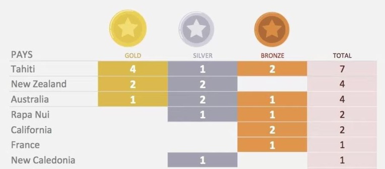 Au bout de deuxième jour de compétition, la Polynésie est en tête du classement des médailles d'or avec 4 médailles. La Nouvelle Zélande est 2e avec 2 médailles d'or et l'Australie est 3e avec une médaille d'or en para va'a. Rapa Nui est 4e avec 1 médaille d'argent et 1 médaille de bronze. SB